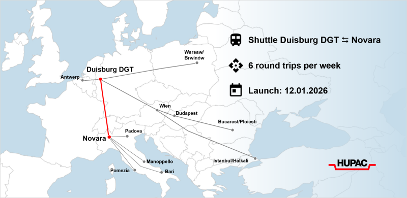 Intermodal transport operator Hupac announced the launch of a new rail service between Duisburg Gateway Terminal (DGT) and Novara CIM, effective January 12, 2026. The project aims to accelerate the shift in freight flows from road to rail and further develop sustainable logistics solutions in Europe.