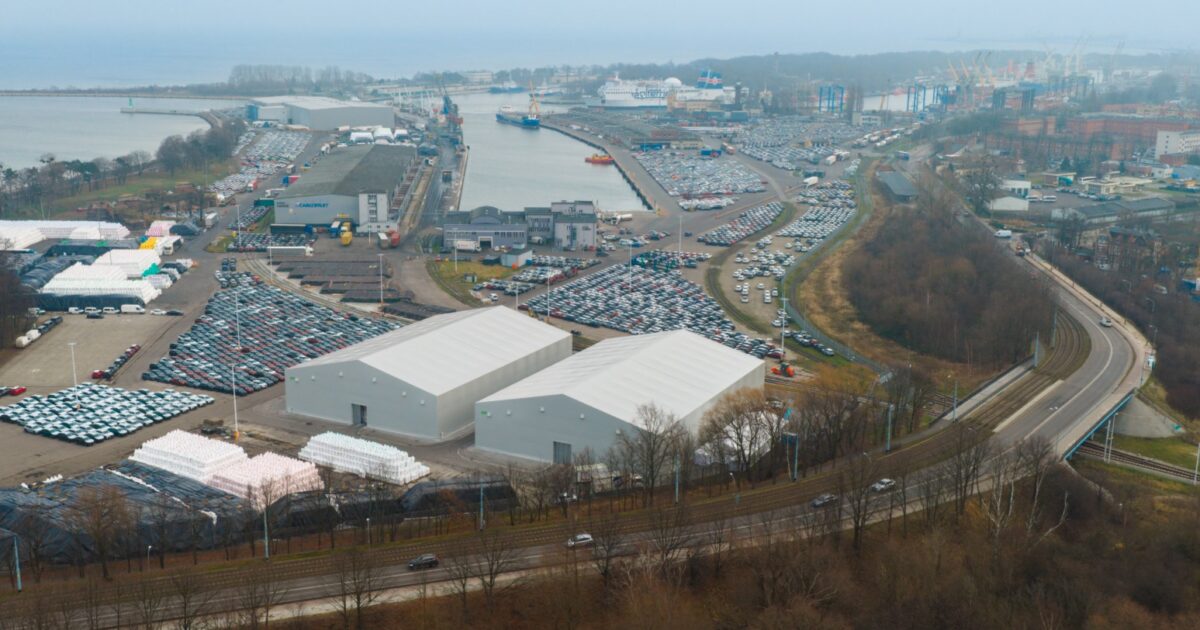Solid Port, the operator, has completed a new investment project at the Free Trade Zone (WOC) quay of the Port of Gdansk, constructing two warehouse complexes for storing organic fertilizers. The facilities, built on land leased from the port for a period of 30 years, consist of tent-covered steel structures measuring 40 x 60 meters each with a ridge height of 14.5 meters. The walls and roof are made of durable PVC coating, allowing the warehouses to efficiently store bulk agricultural cargo in big bags with a capacity of 500, 600, and 1,000 kg, stacked up to four high. The total storage capacity at the site reaches 12,160 tons.