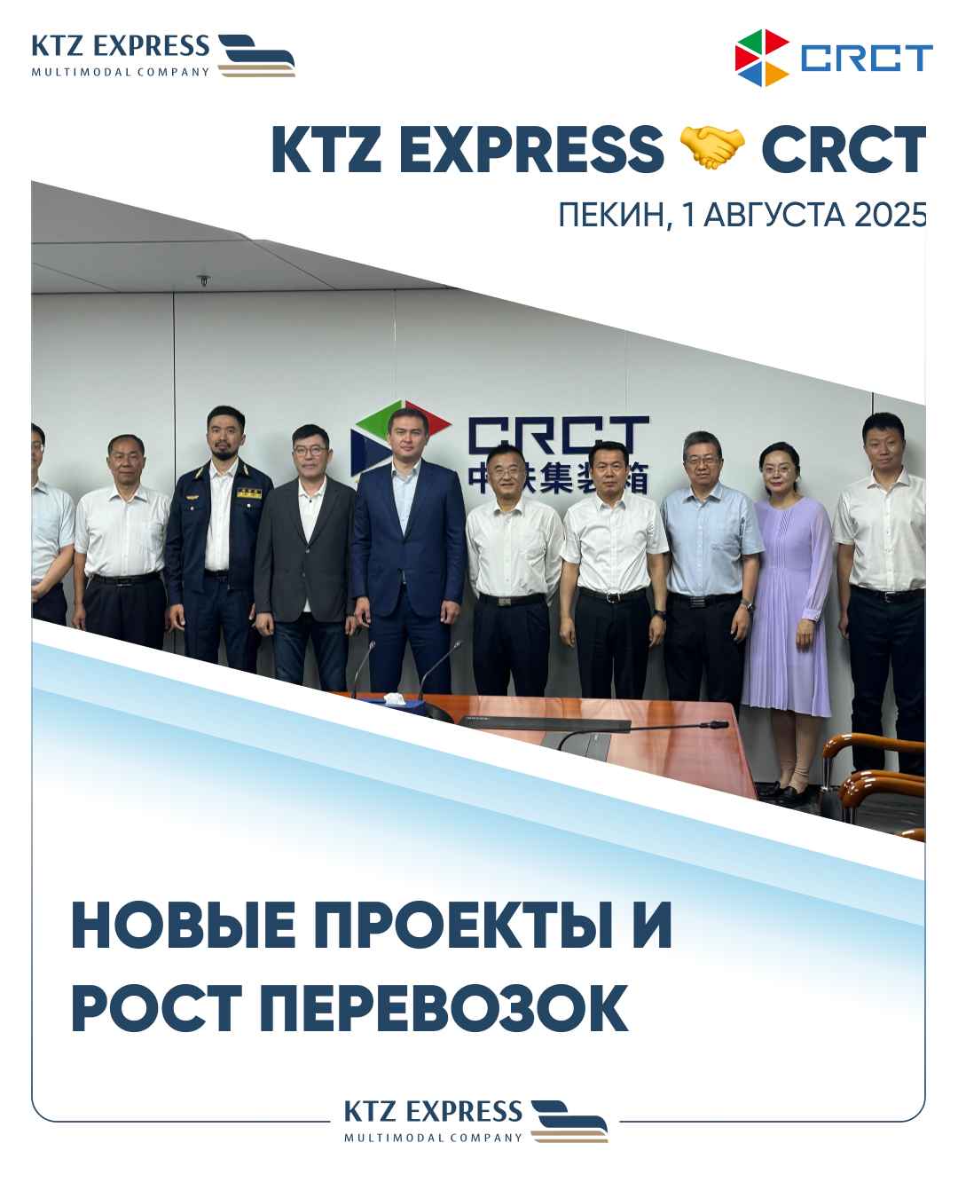 On August 1, 2025, in Beijing, a KTZ Express delegation headed by General Director D. M. Kozhakhmetov held a working meeting with the management of China Railway Container Transport Co., Ltd. (CRCT). The meeting was attended by General Director Zhong Cheng, Deputy General Directors Wang Dezhan and Zhang Dongliang, as well as customer service and special projects specialists from CRCT.